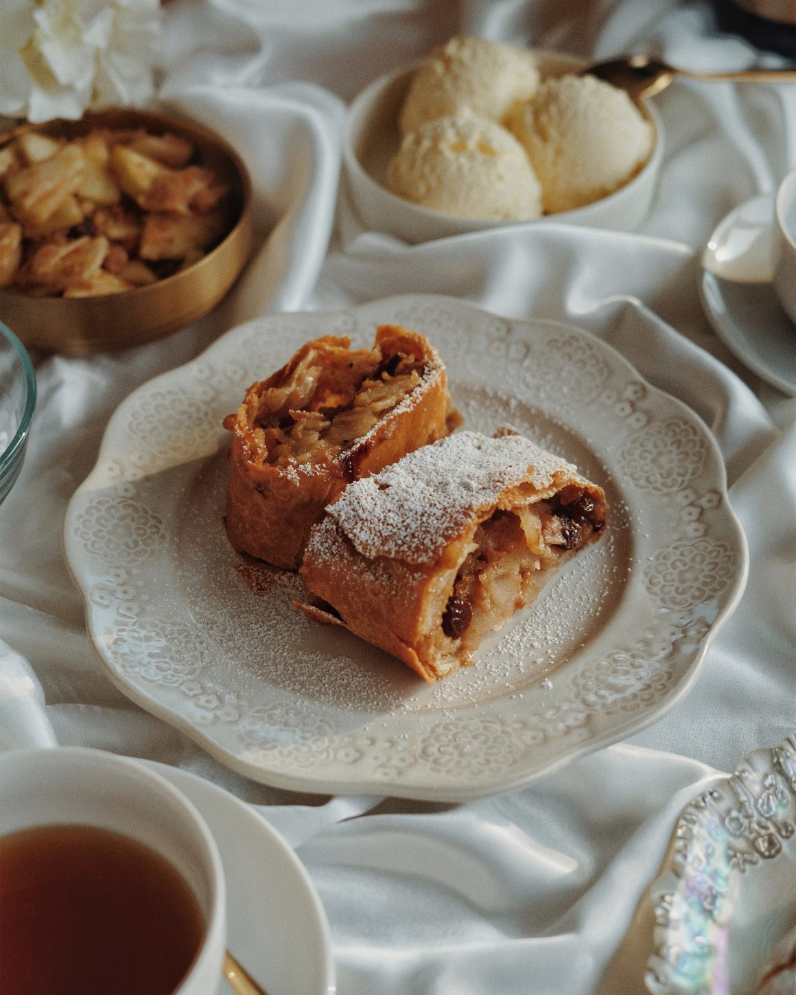 This traditional Austrian pastry is made of thin layers of stretched dough wrapped around an  apple filling typically with raisins, cinnamon and breadcrumbs. It tastes amazing straight out of the oven, especially with some whipped cream or a scoop of ice cream.