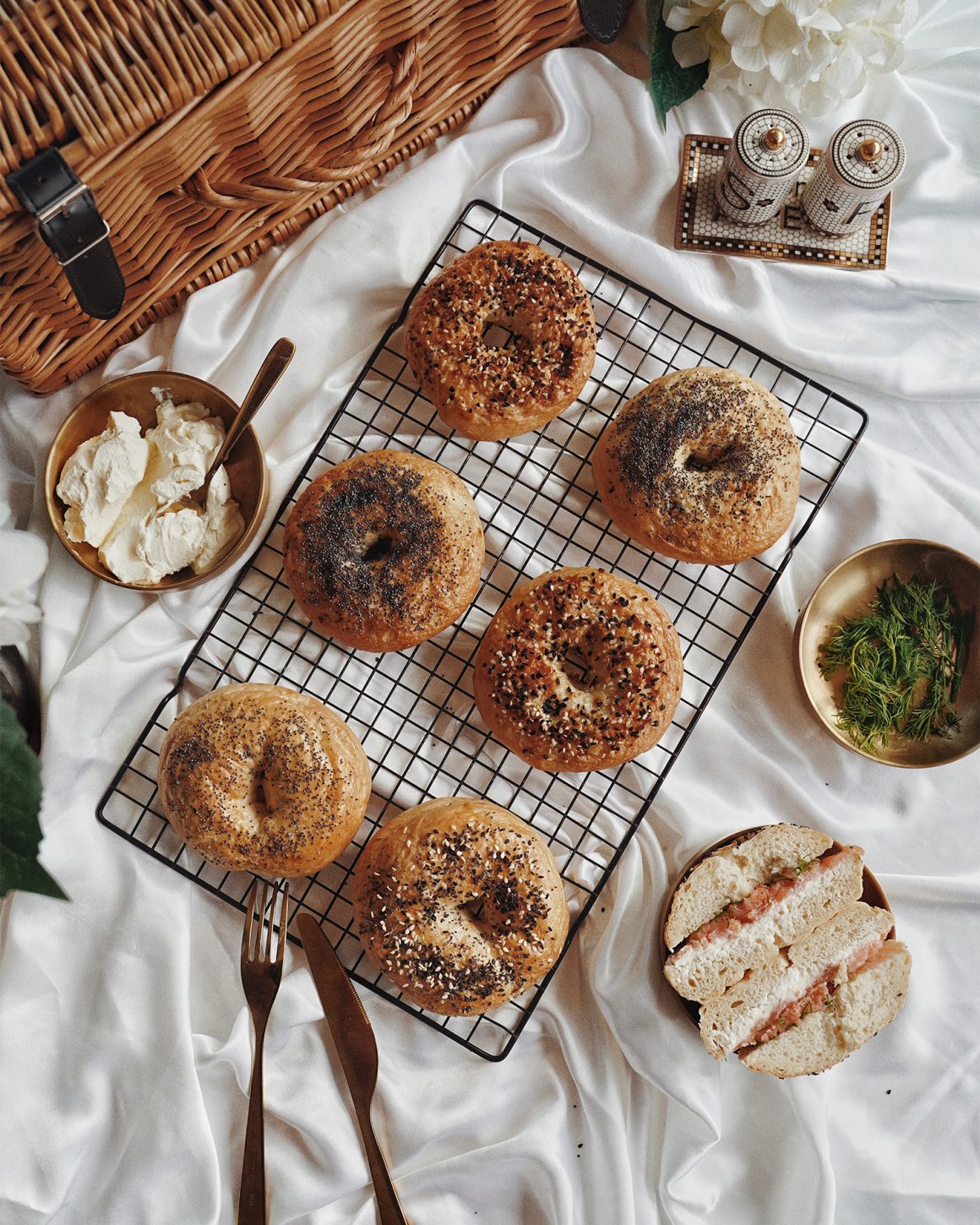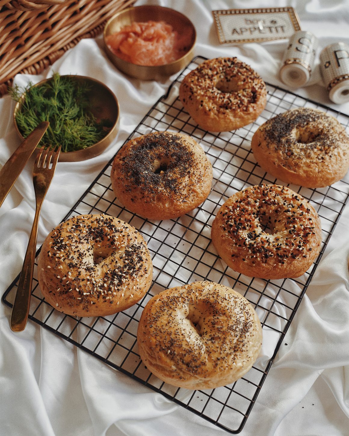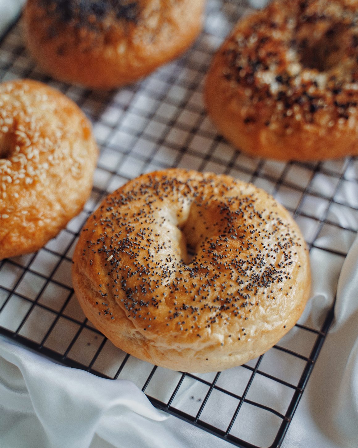 - Shaping the bagel: there’s a simpler way to shape the bagel where you just poke a hole and expand it. However this will not press out the air bubbles properly. That’s why I chose to do the rope method instead!