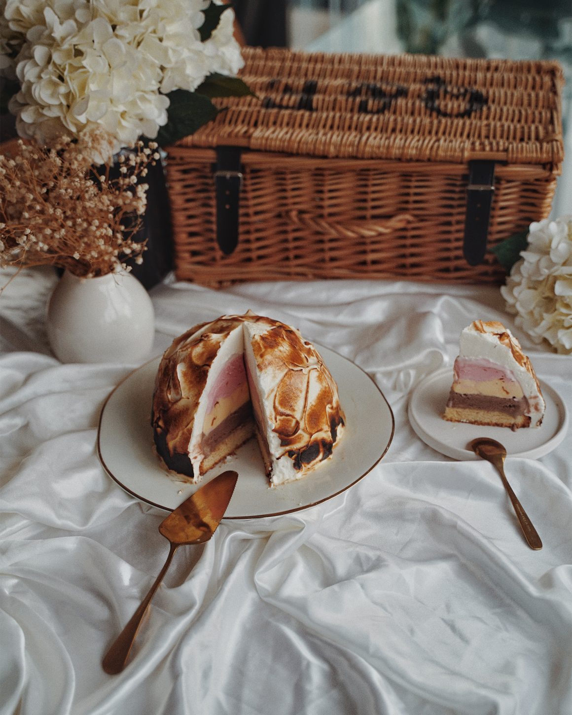 As its name suggests baked Alaska are usually quickly baked in the oven to toast the meringue layer. However I decided to make it more fun by using the blow torch and uhm… set it up on fire!