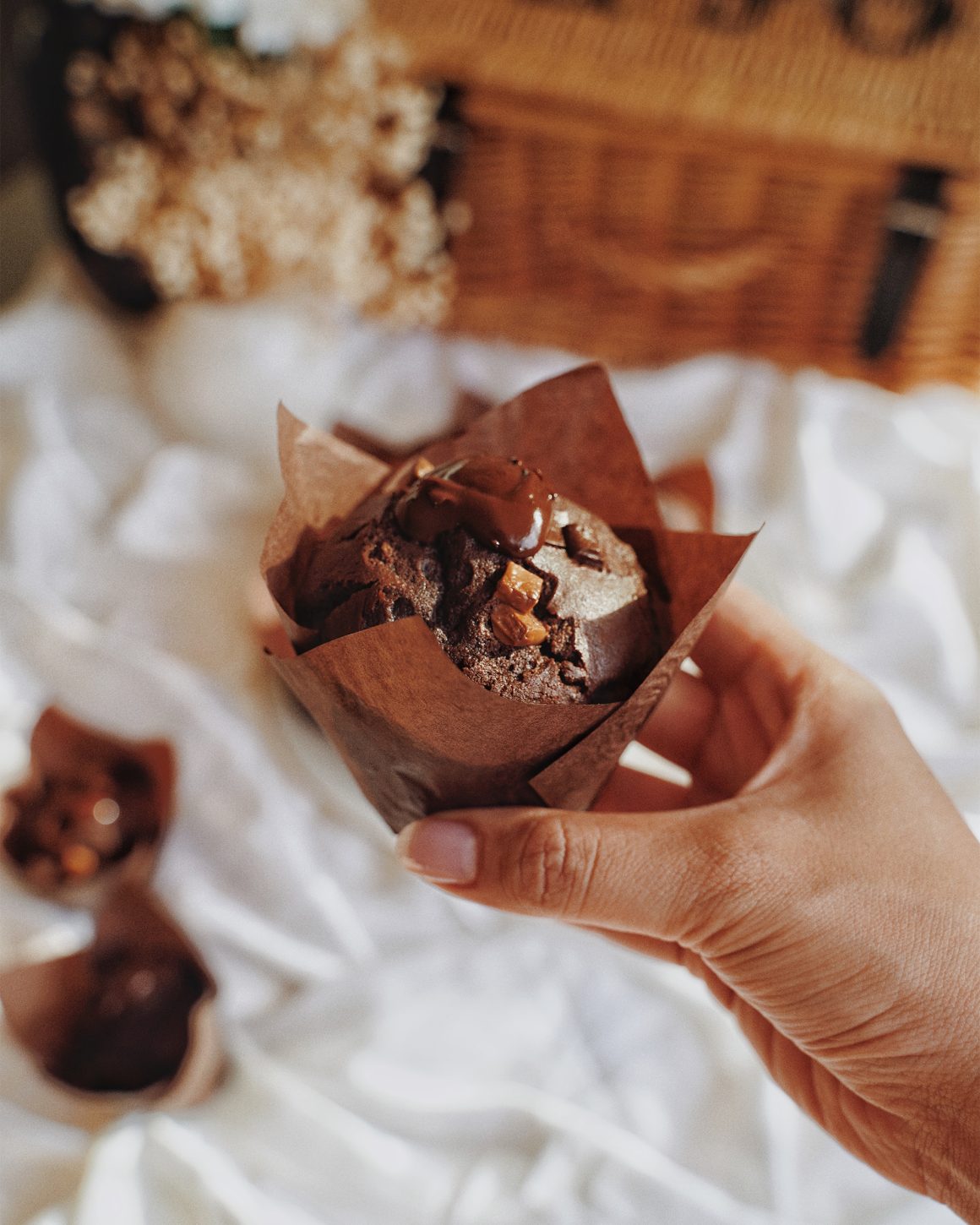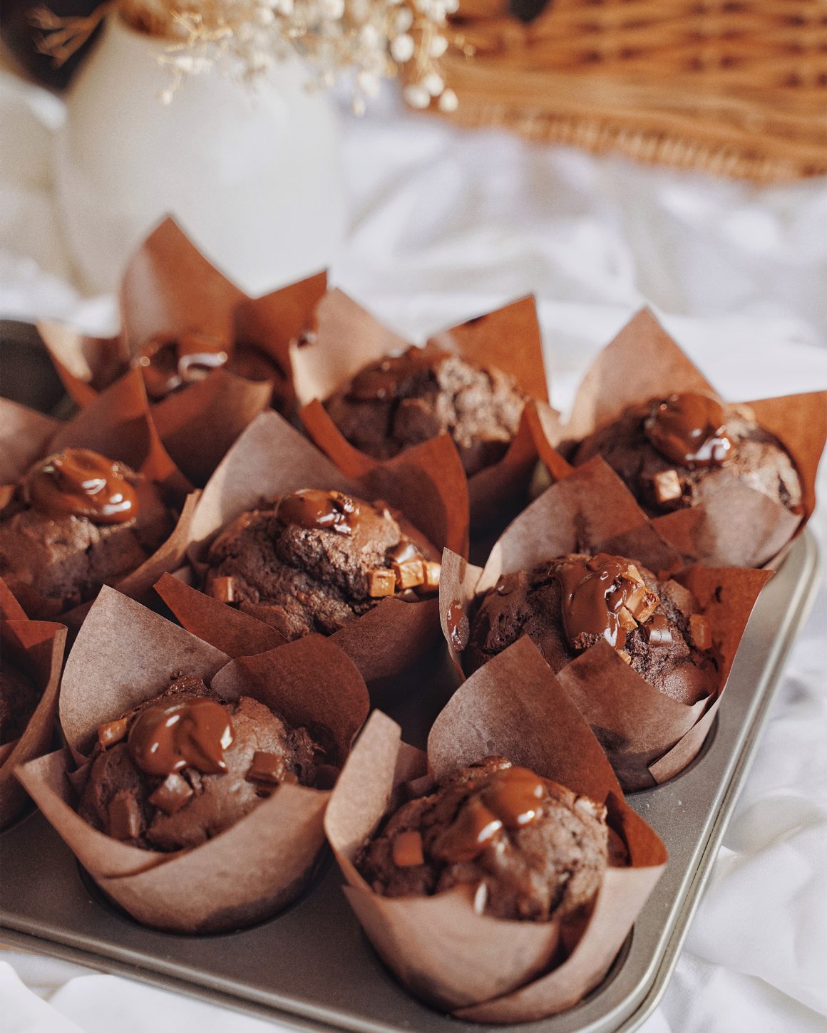 - Sprinkle the remaining chocolate chunks on top of each muffin.