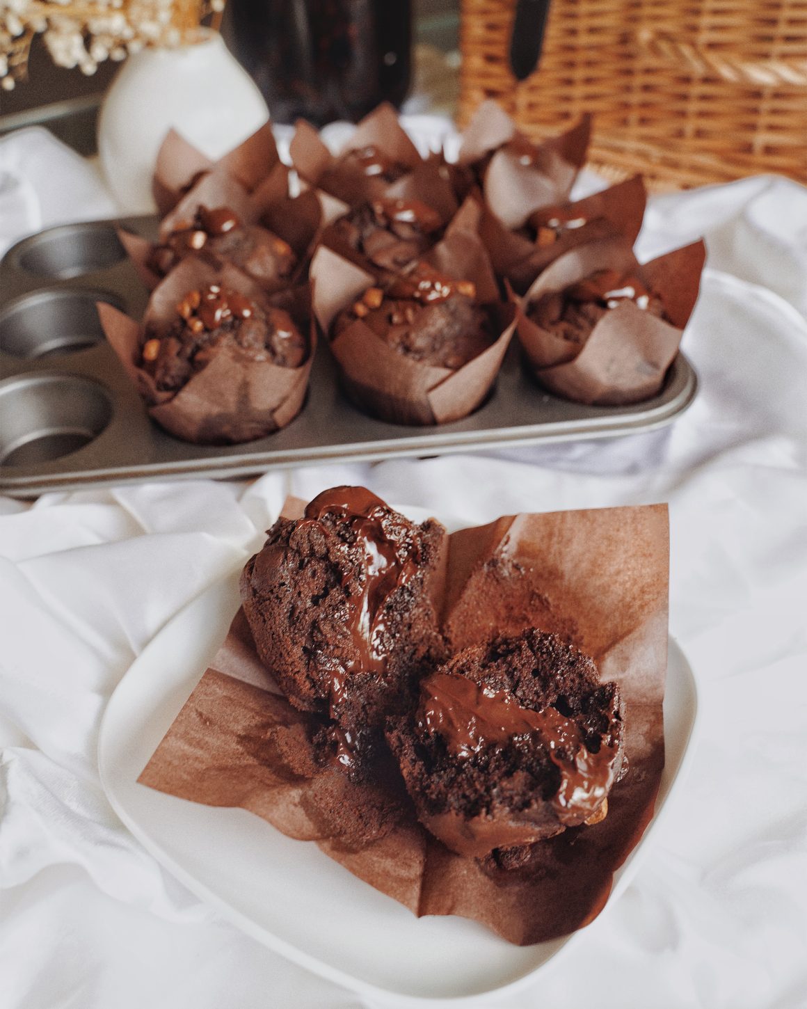 Here’s my take on the viral muffin. I did some research and the original muffin seems to be produced by Coup de Pates. I based mine off a red velvet sponge (omitting the colouring) for a moist texture and added loads of chocolate chips and a decadent ganache. It’s super easy to recreate and I tried to make it as close looking to the original as possible.