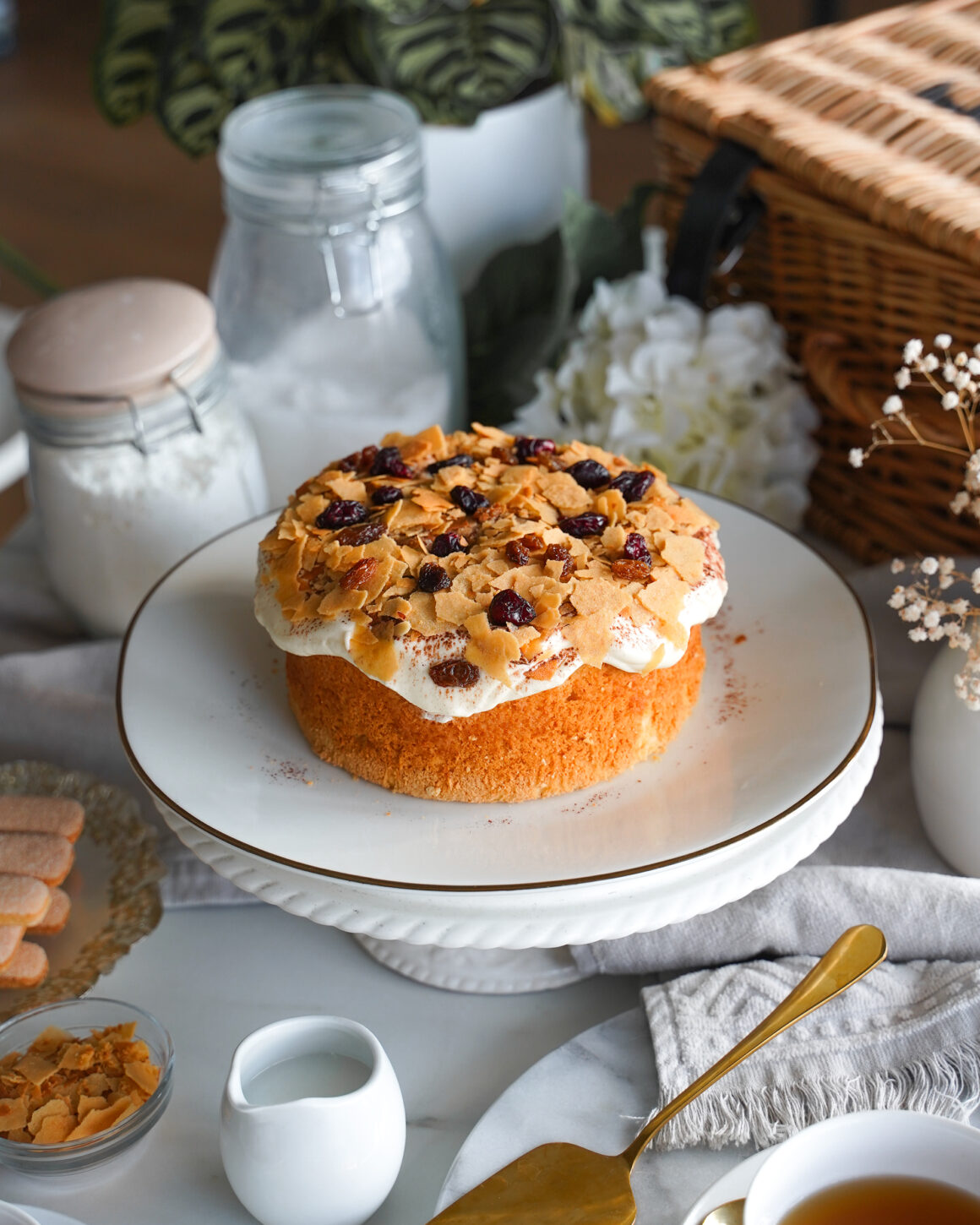 - Assemble: remove the chiffon cake from pan, pour the cream on top, sprinkle a layer of cocoa powder, top with the crispy crepe and dried sultanas and cranberries